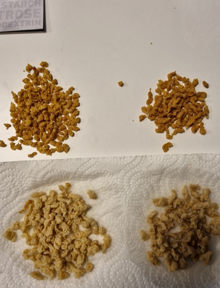 Buğday VE Bezelye nin Ekstürider makine ile Isı ve kurutma yapılarak Tekstüre elde edilen Garanül halde bir üründür.